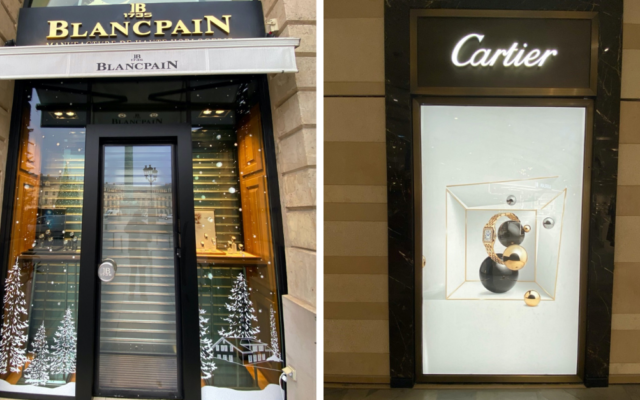 Pour Breguet, la vitrine reprend les codes de la marque tout en évoquant une ambiance hivernale aux couleurs naturelles. La mise en scène, qui donne de la profondeur à la vitrine, a été réalisé grâce à des découpes de PVC, avec impression UV, décalés sur plusieurs plans.