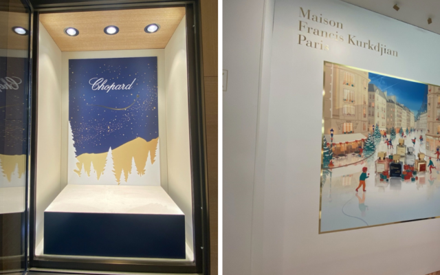 Une décoration épurée et sobre utilisant les couleurs traditionnelles de Noël et suggérant une ambiance luxueuse qui convient parfaitement à Cartier.